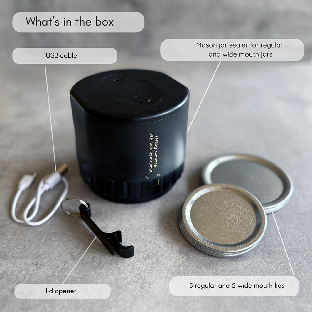 The FreshPrep™ Mason Jar Sealer contains a sealer for regular and wide mouth jars, as well as 5 regular and 5 wide mouth lids, a usb charging cable and a can opener.